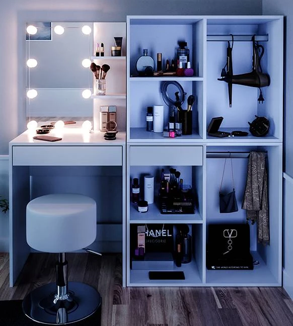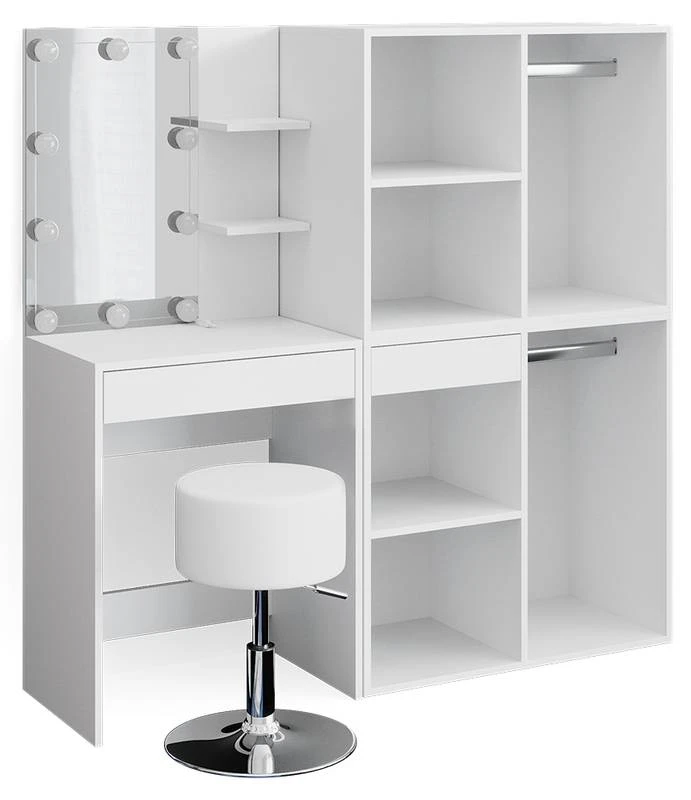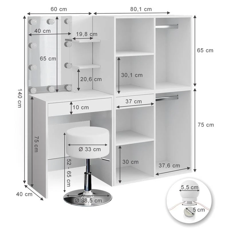 - Contenu de la livraison : • 1x coiffeuse • 1x tabouret design • 1x guirlande lumineuse • 1x meuble avec tiroir • 1x meuble Décoration non incluse
