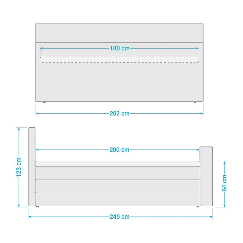 - Contenu de la livraison : 2 matelas, surmatelas, tête de lit, pied de lit avec support TV intégré, sommier tapissier avec coffre de lit, instructions et matériel de montage